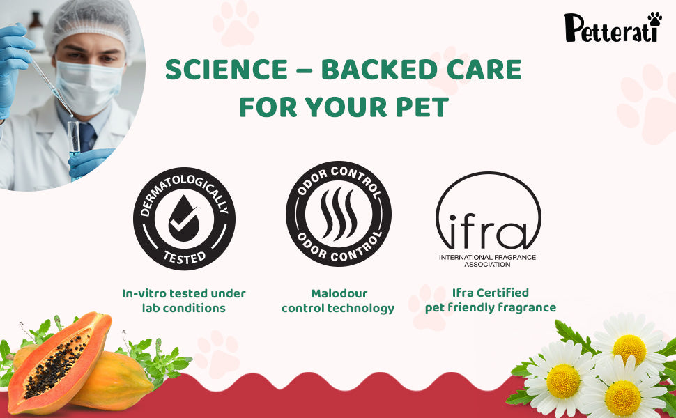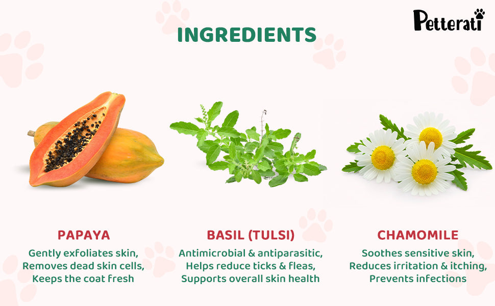 Papaya helps cleanse the coat, Tulsi supports skin hygiene, and Chamomile soothes the skin for a calm, comfortable bath experience. - Malodour Neutraliser