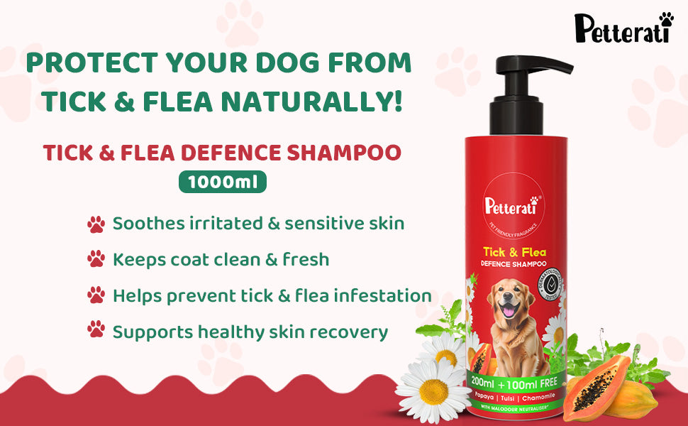Petterati Tick & Flea Defence Dog Shampoo | With Goodness of Papaya, Tulsi, Chamomile | Shampoo + Conditioner 1000ml Dermatologically Tested with Malodour Neutraliser and Pet Friendly Fragrance