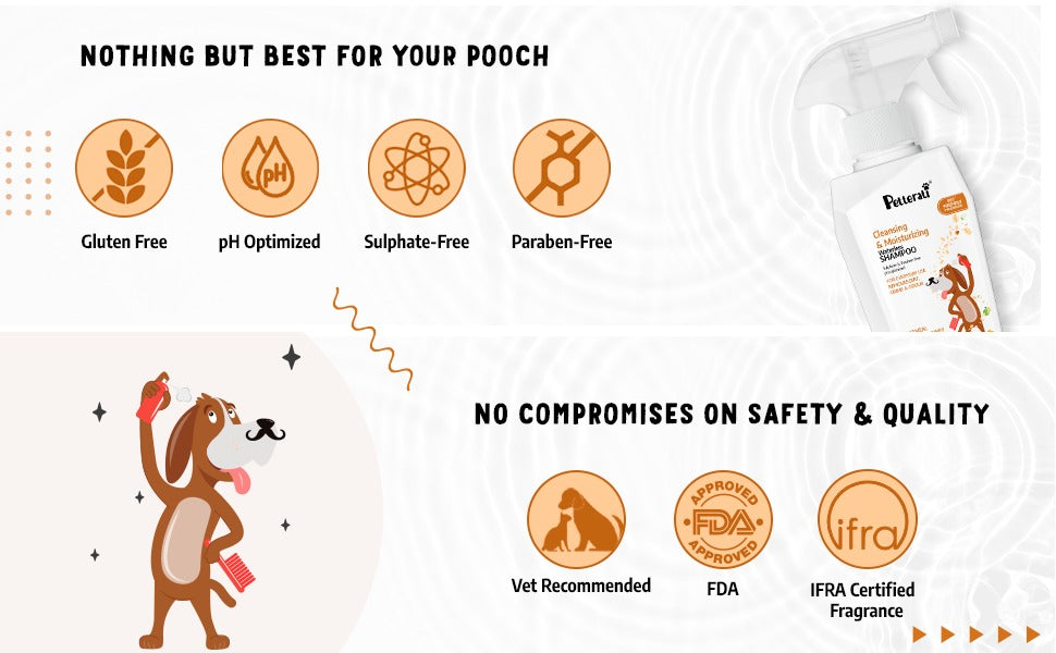 Petterati Cleansing & Moisturizing Waterless Shampoo is a safe and gentle product for your dog’s skin and fur. It is gluten free, pH optimized, paraben free, has IFRA certified pet friendly fragrance and its FDA Approved. It soothes inflammation, nourishes and moisturises dry skin. It gives your dog the best care possible.